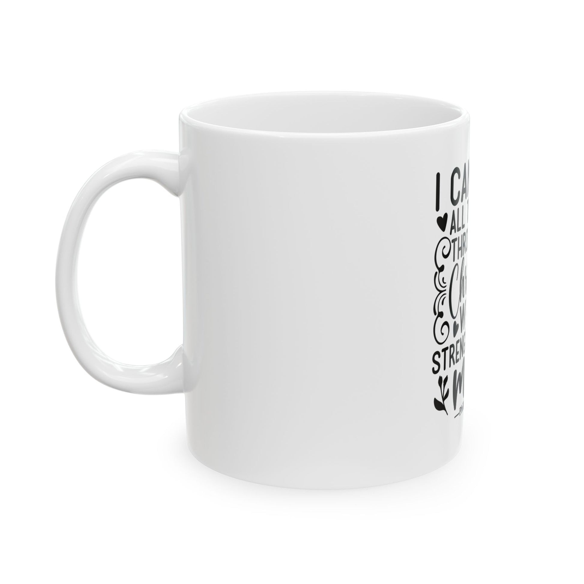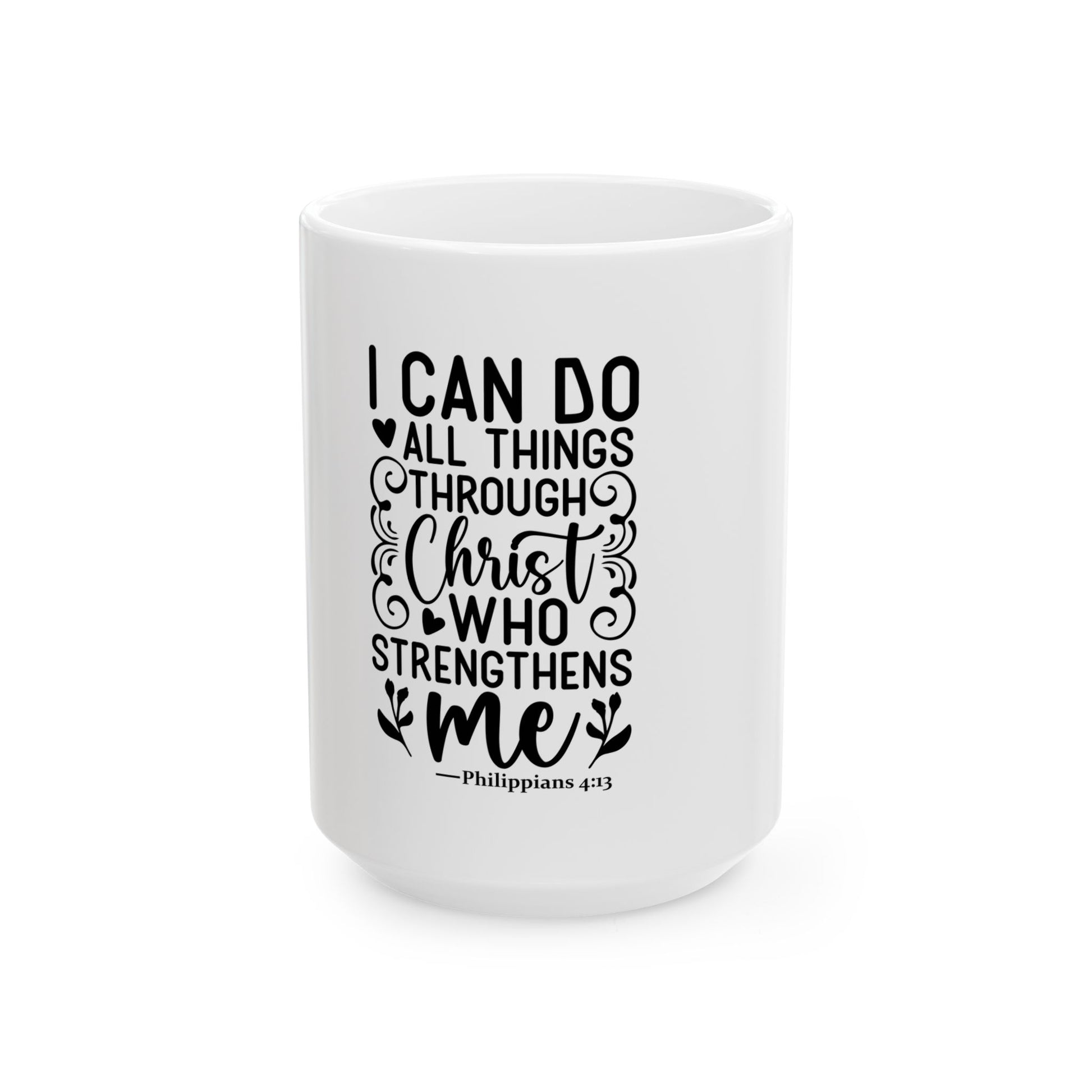A Scripture Inspired white ceramic mug quoting Philippians 4:13. This is a perfect gift for birthdays, anniversaries, ordinations, events, father's day, celebrations or just to show appreciation.