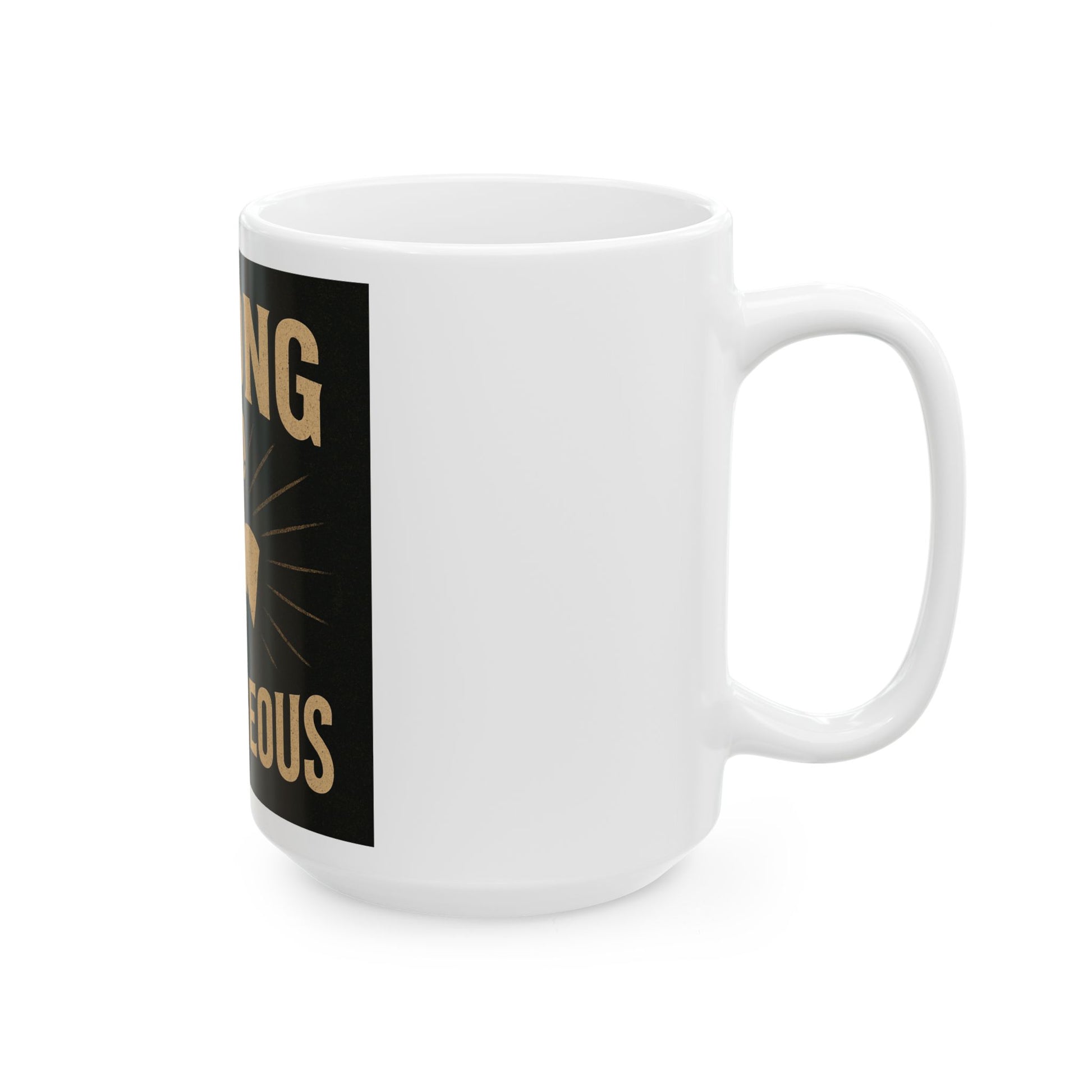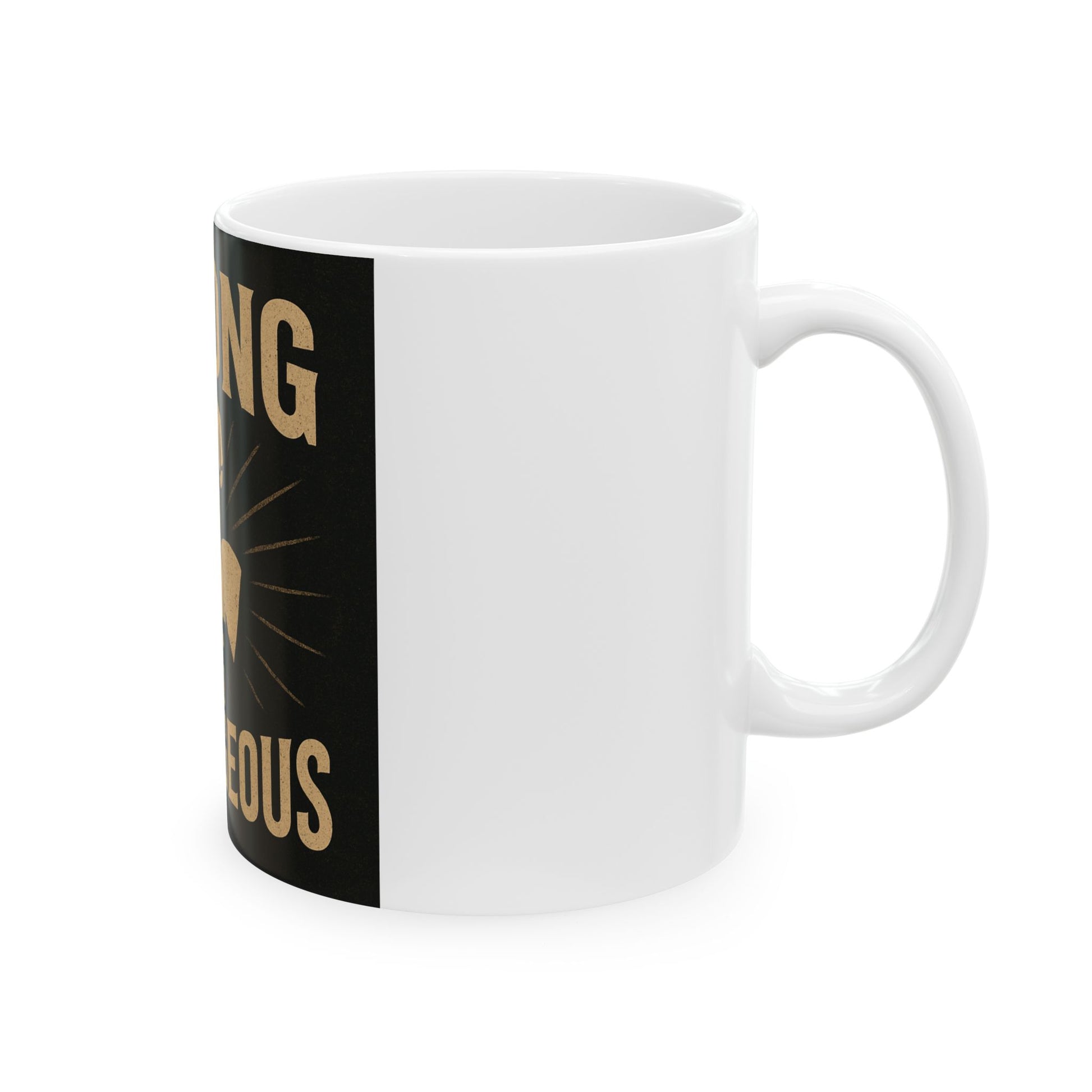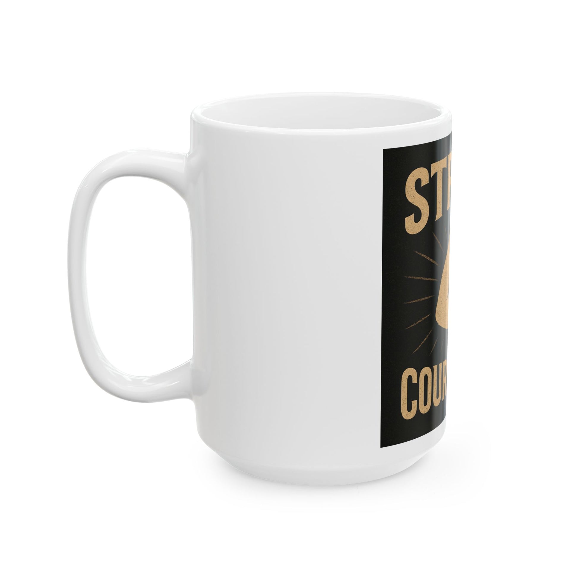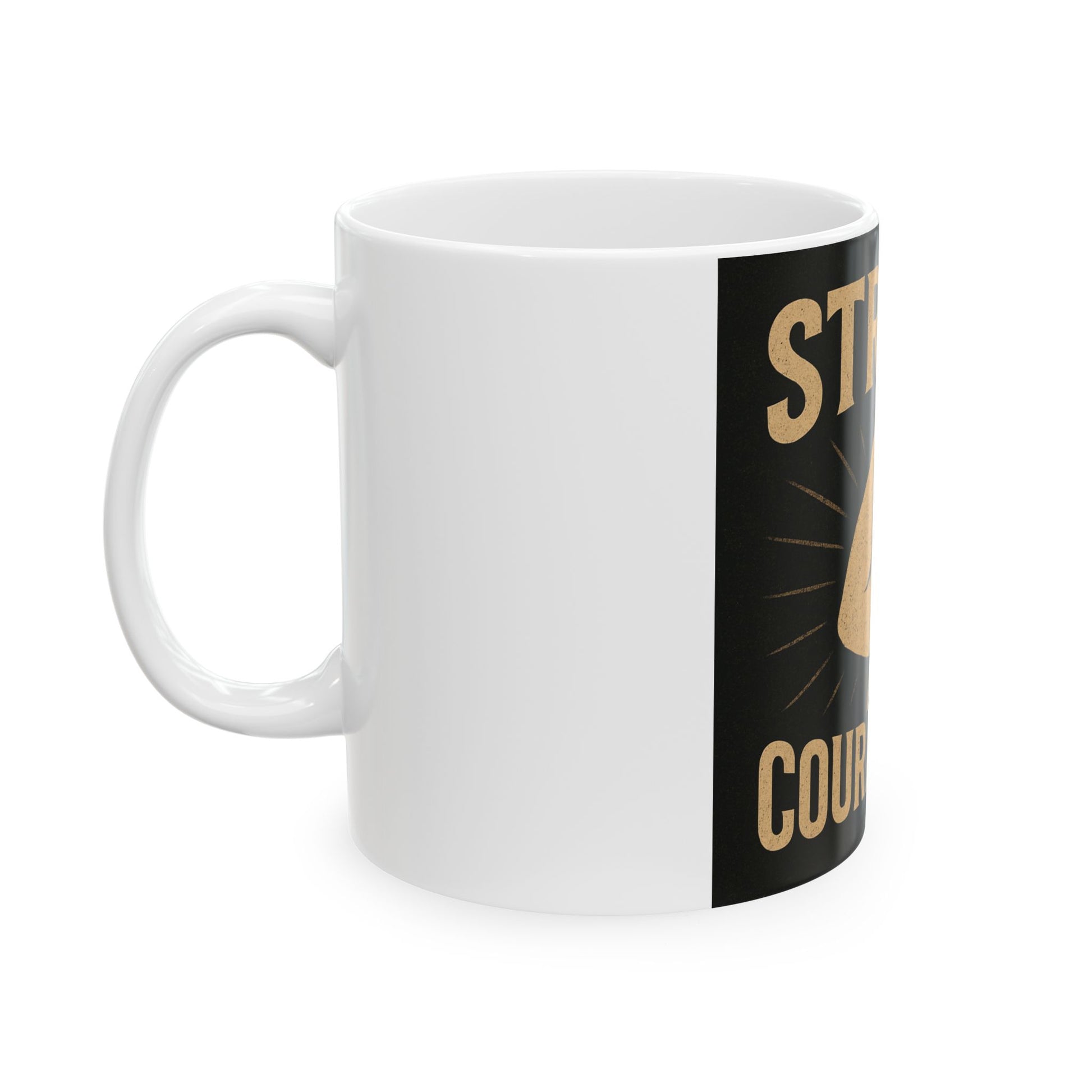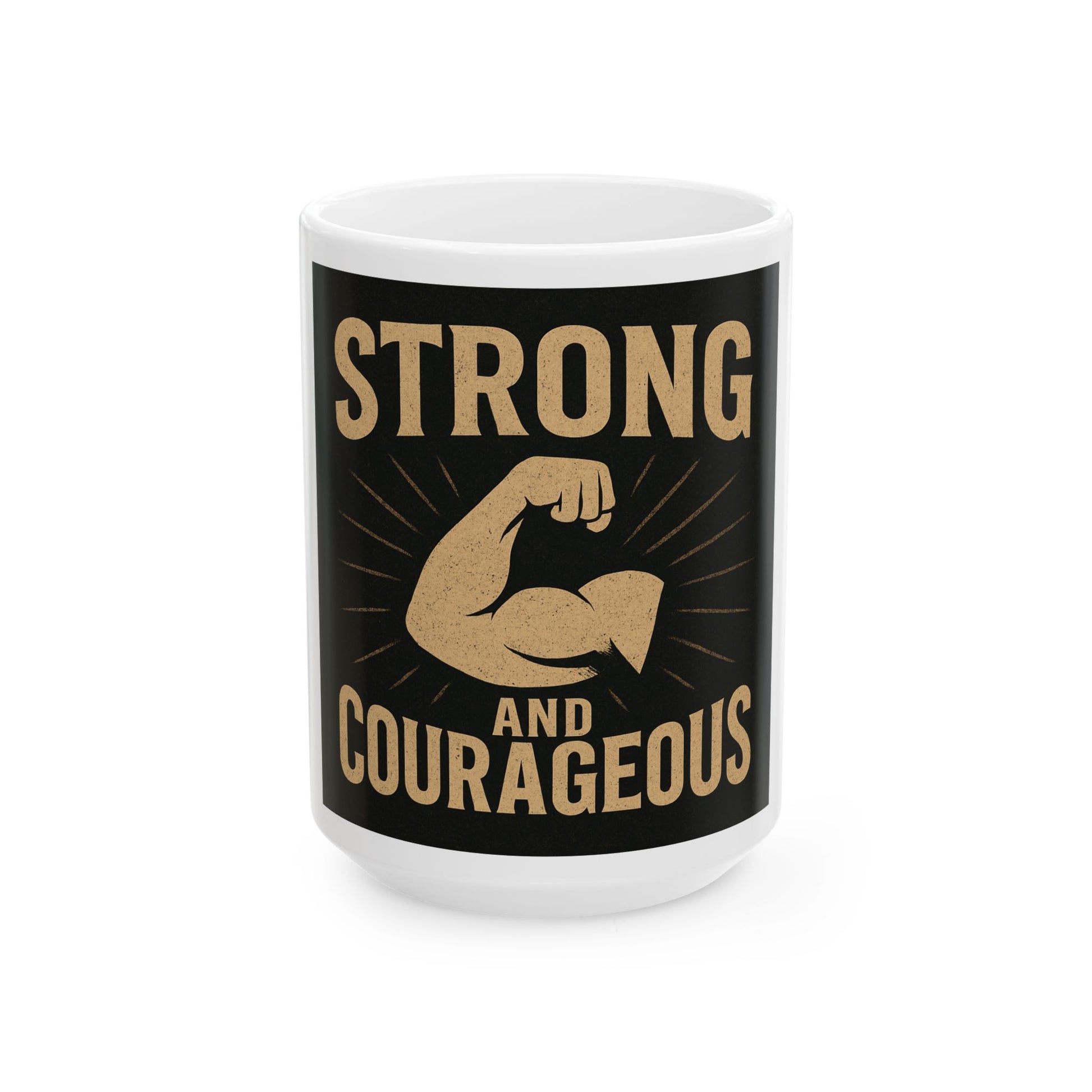 A Scripture Inspired white ceramic mug quoting strong and courageous . This is a perfect gift for birthdays, anniversaries, ordinations, events, father's day, celebrations or just to show appreciation.
