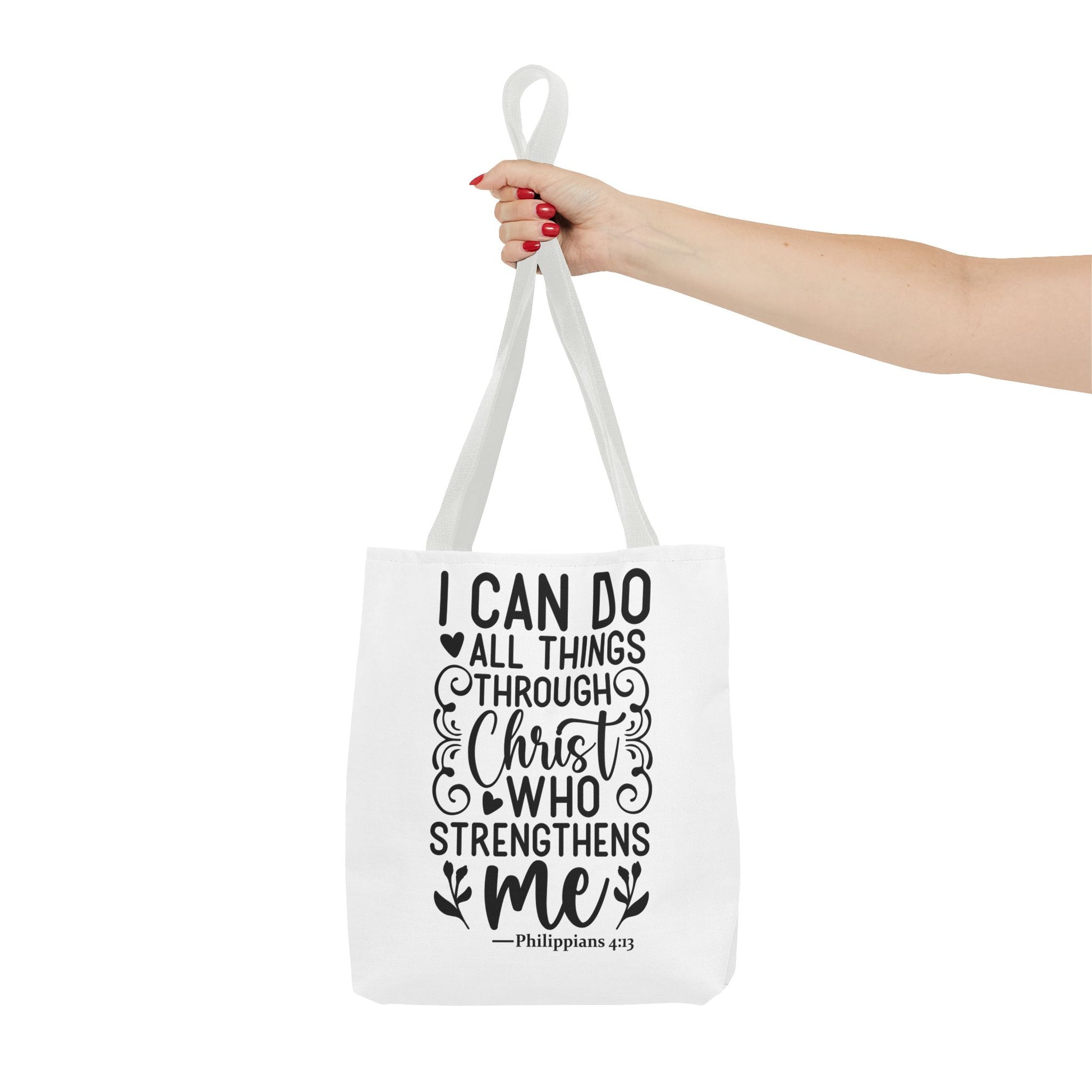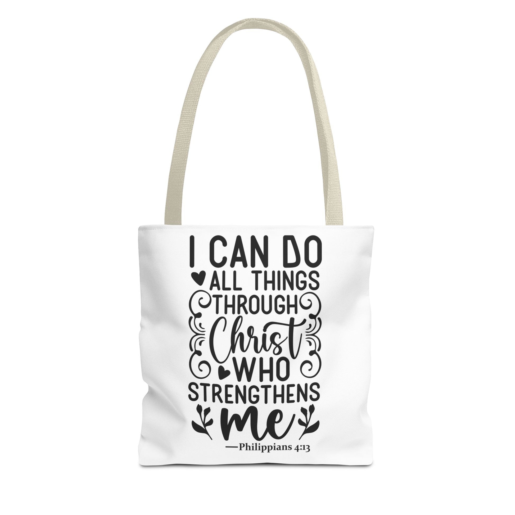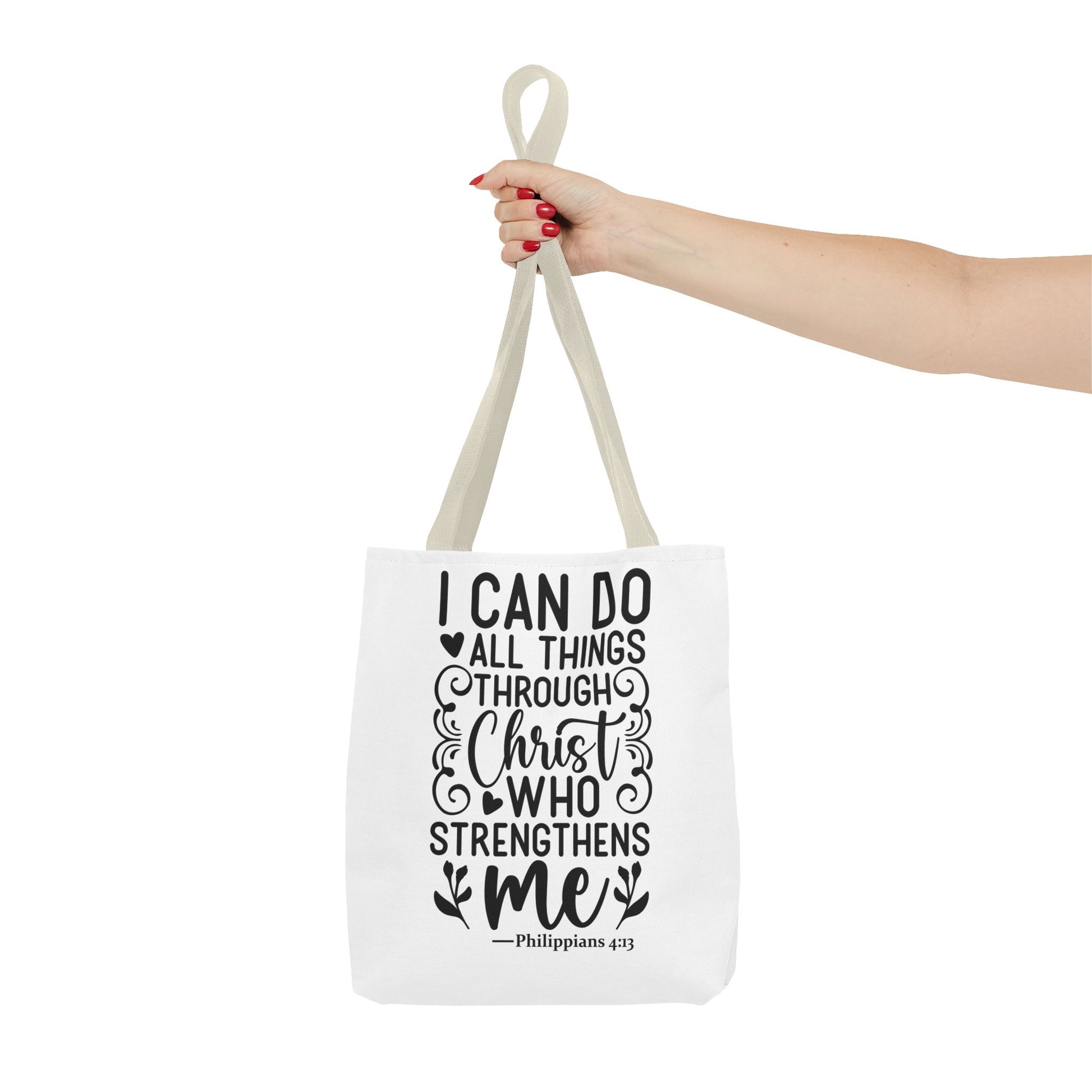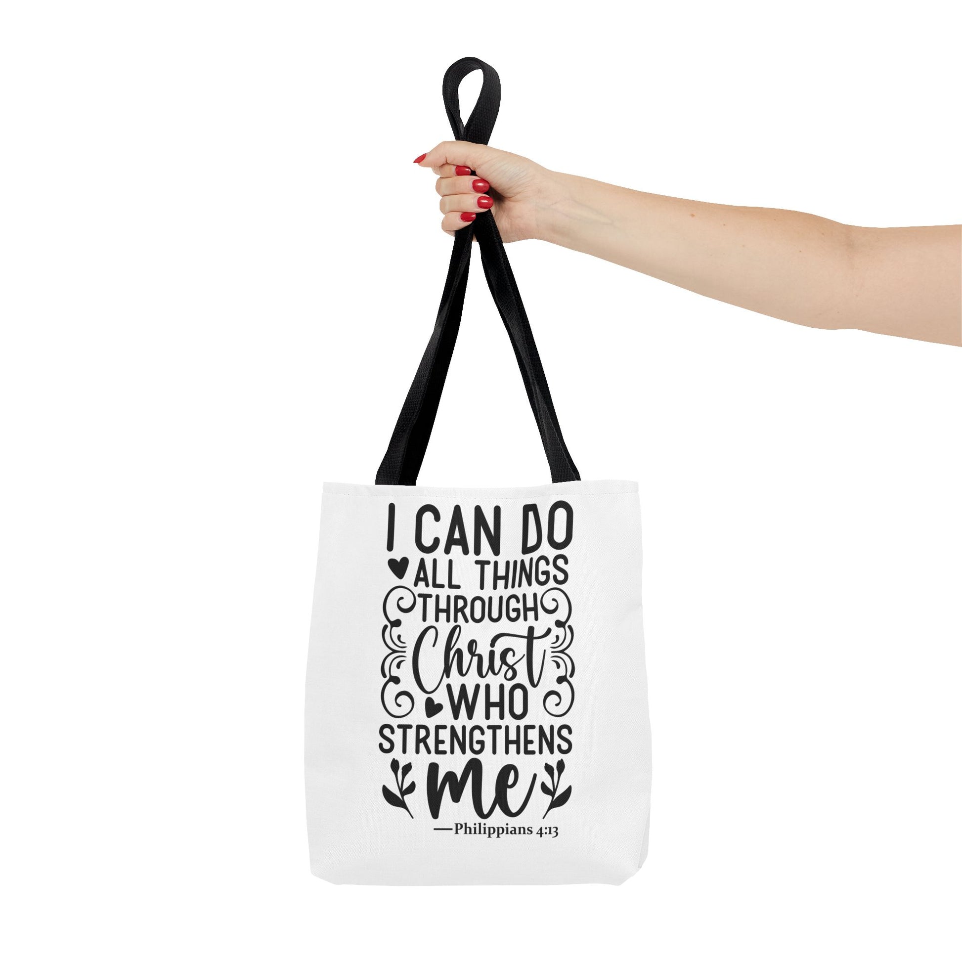 A stylish and functional Tote BAG. Made from durable 100% polyester, this tote is designed to withstand everyday use while retaining its shape. Its eye-catching design is inspired by Scripture - 'I can do all things through Christ who strengthens me' from Philippians 4:13. Ideal for daily errands, gym visits, or beach outings. It makes a thoughtful gift for birthdays, mothers day, events or just because.