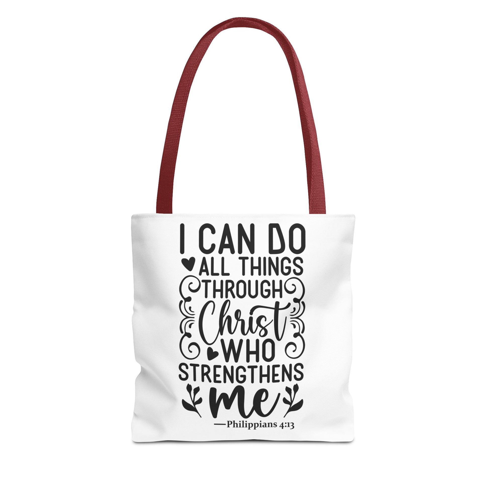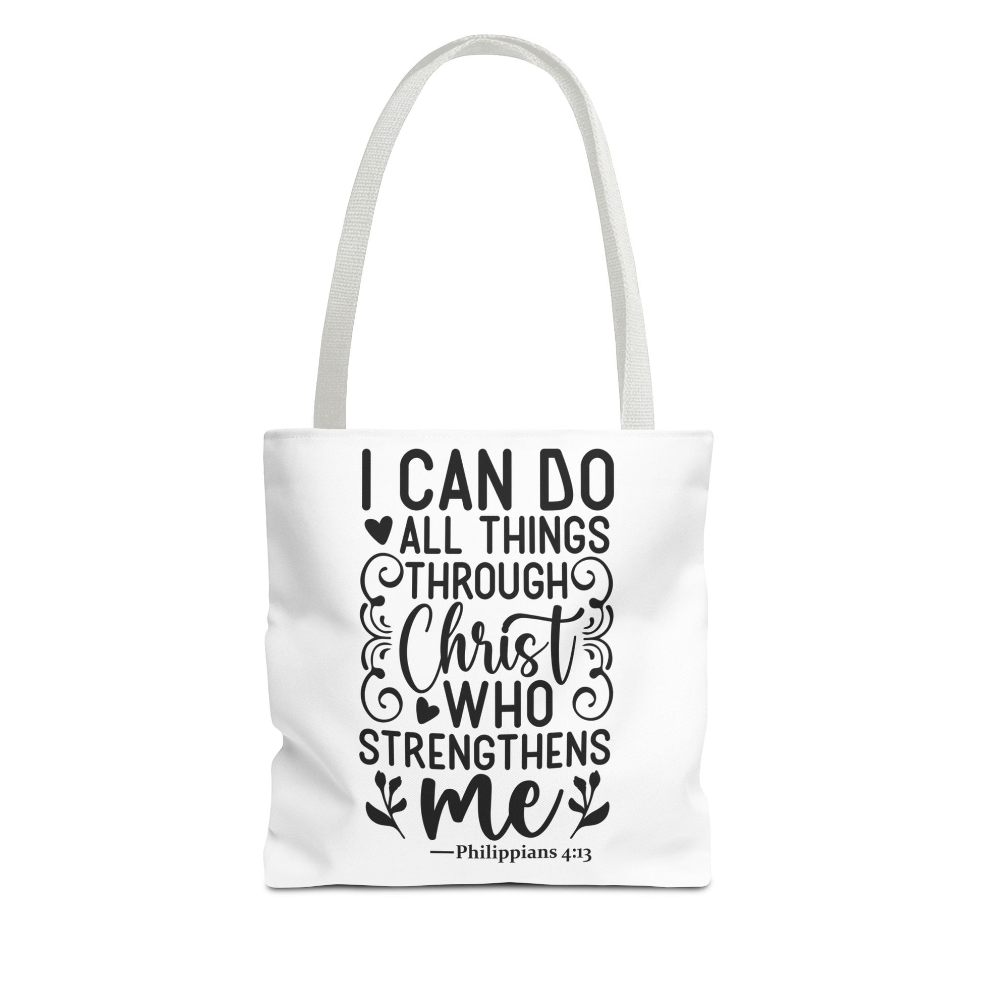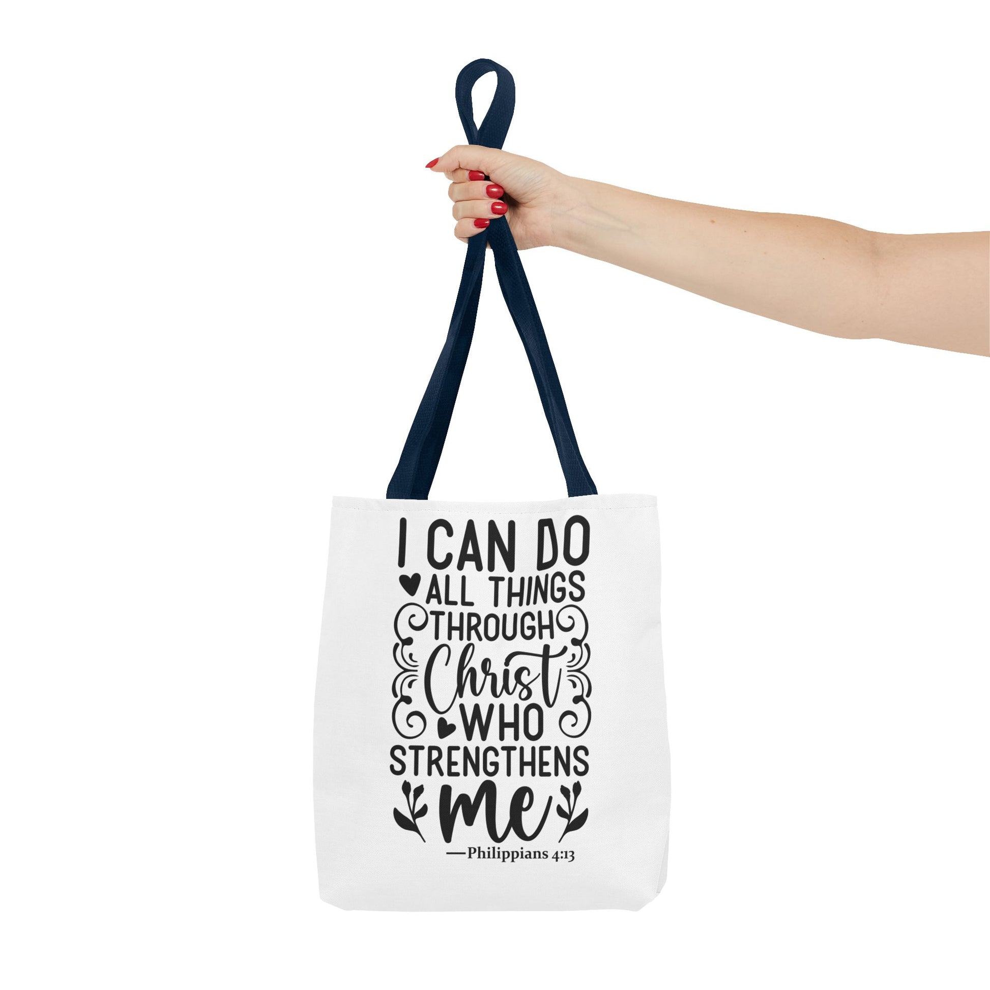 A stylish and functional Tote BAG. Made from durable 100% polyester, this tote is designed to withstand everyday use while retaining its shape. Its eye-catching design is inspired by Scripture - 'I can do all things through Christ who strengthens me' from Philippians 4:13. Ideal for daily errands, gym visits, or beach outings. It makes a thoughtful gift for birthdays, mothers day, events or just because.