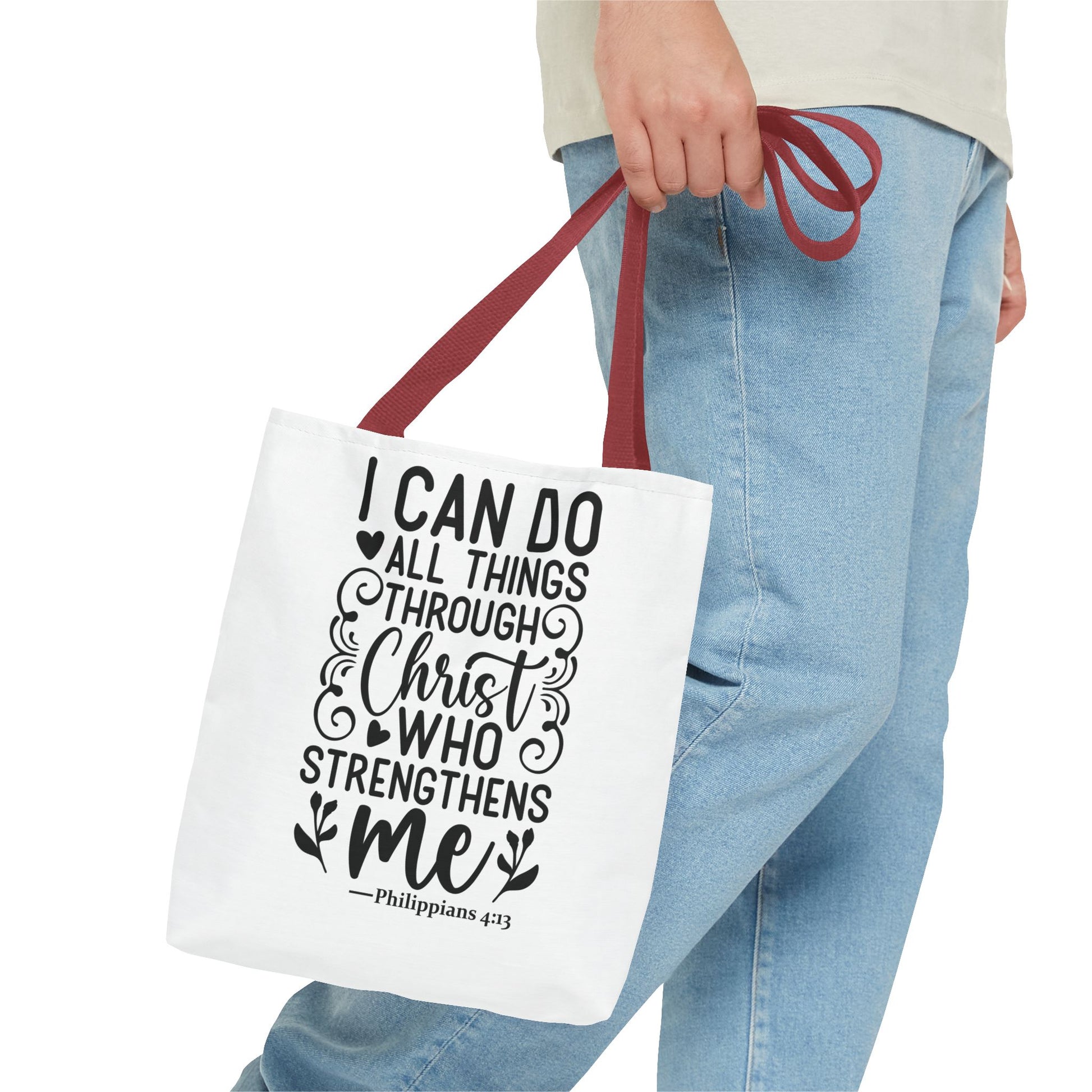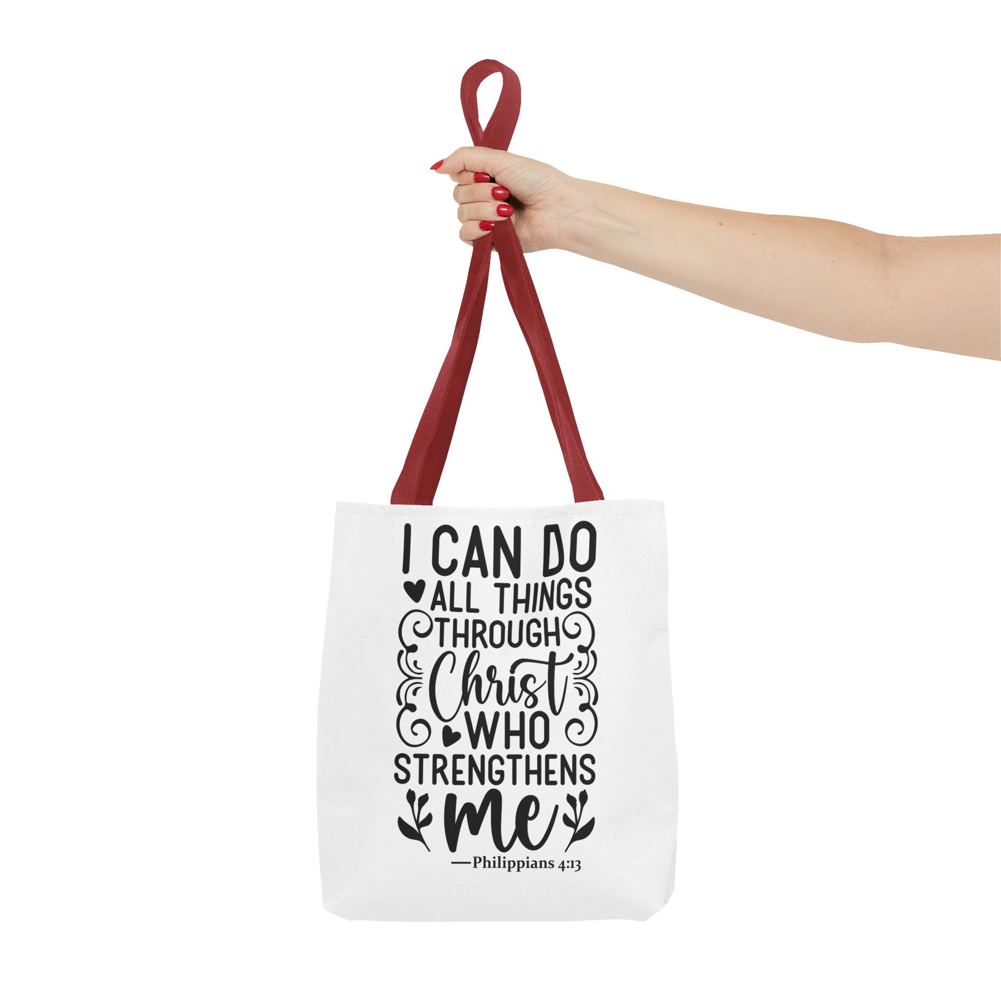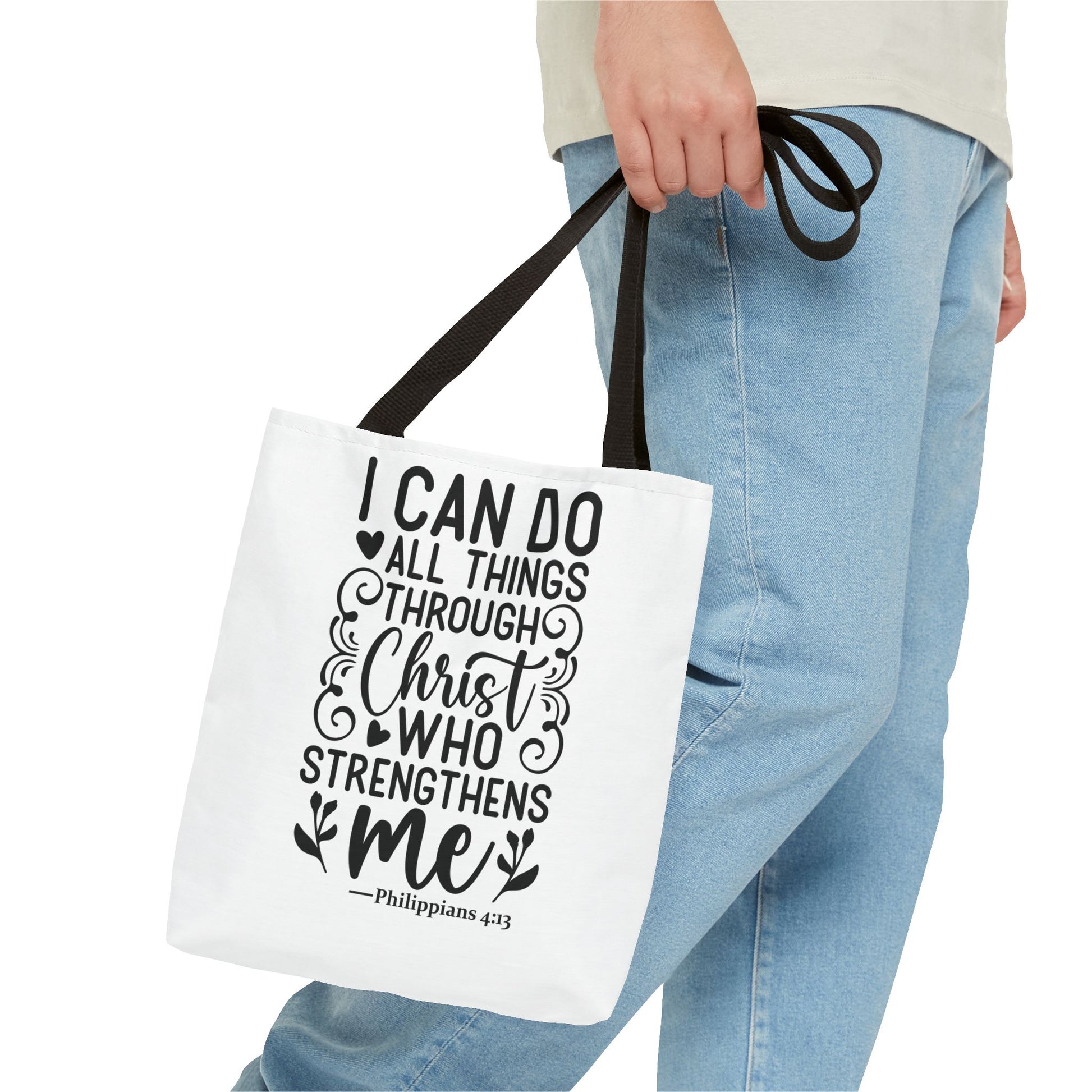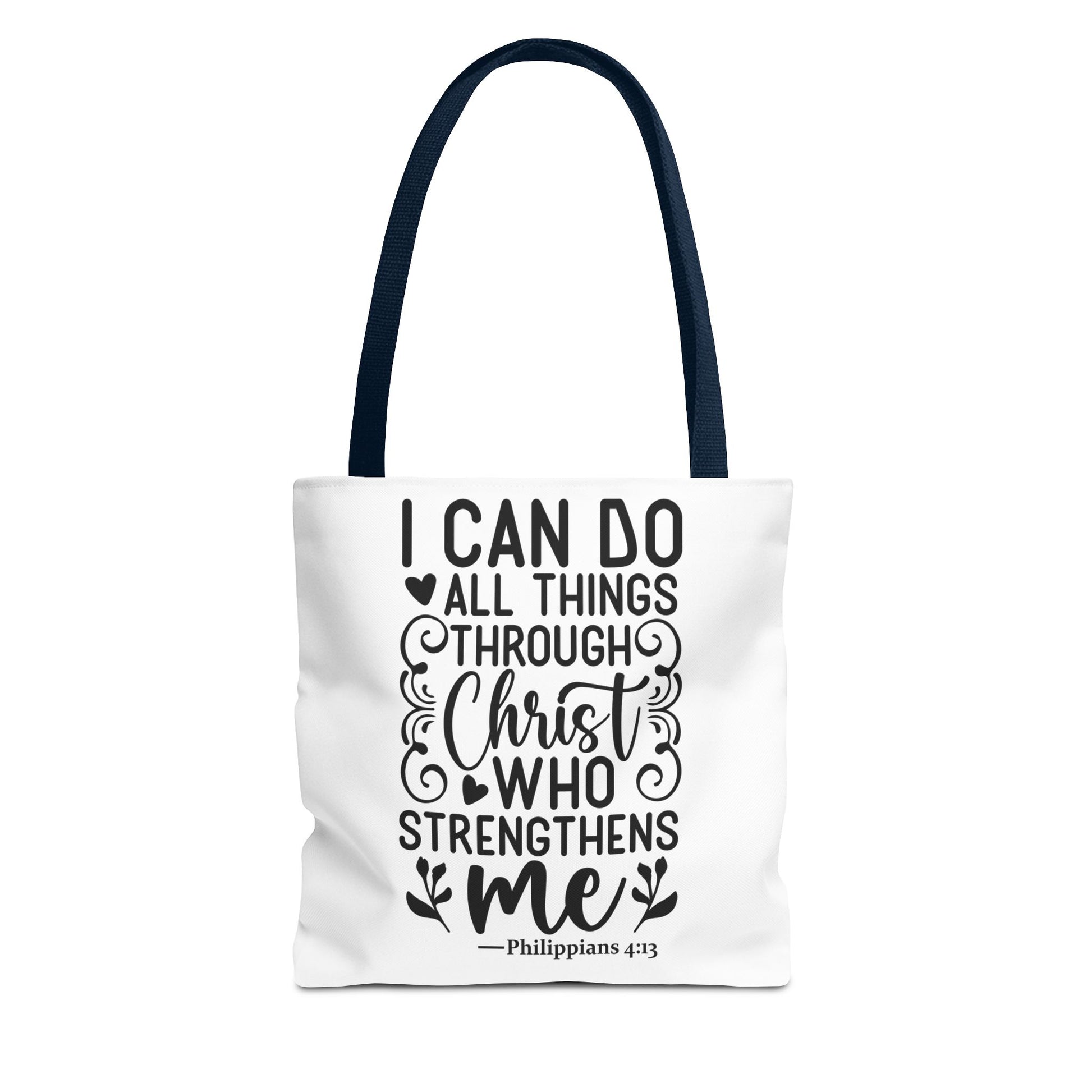 A stylish and functional Tote BAG. Made from durable 100% polyester, this tote is designed to withstand everyday use while retaining its shape. Its eye-catching design is inspired by Scripture - 'I can do all things through Christ who strengthens me' from Philippians 4:13. Ideal for daily errands, gym visits, or beach outings. It makes a thoughtful gift for birthdays, mothers day, events or just because.