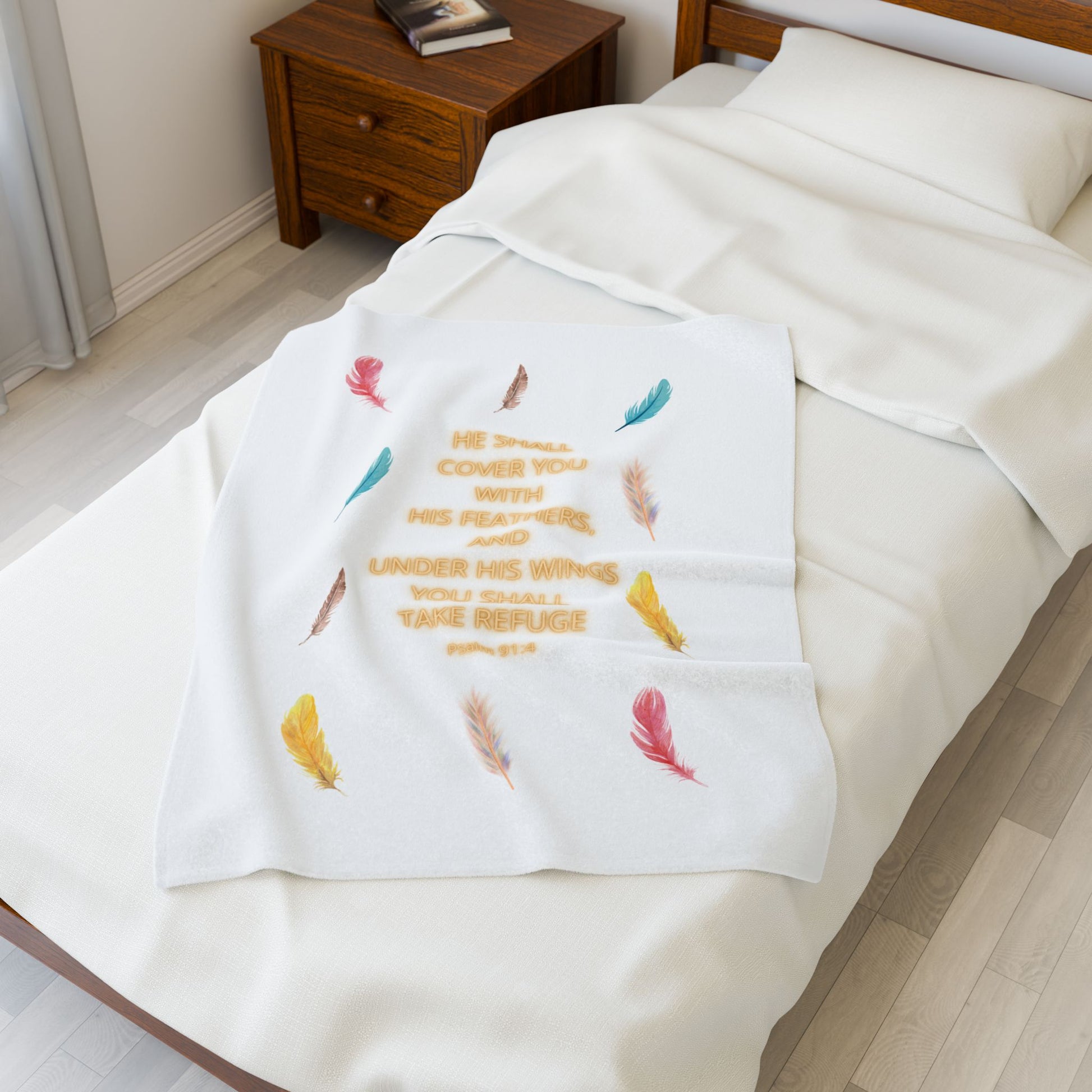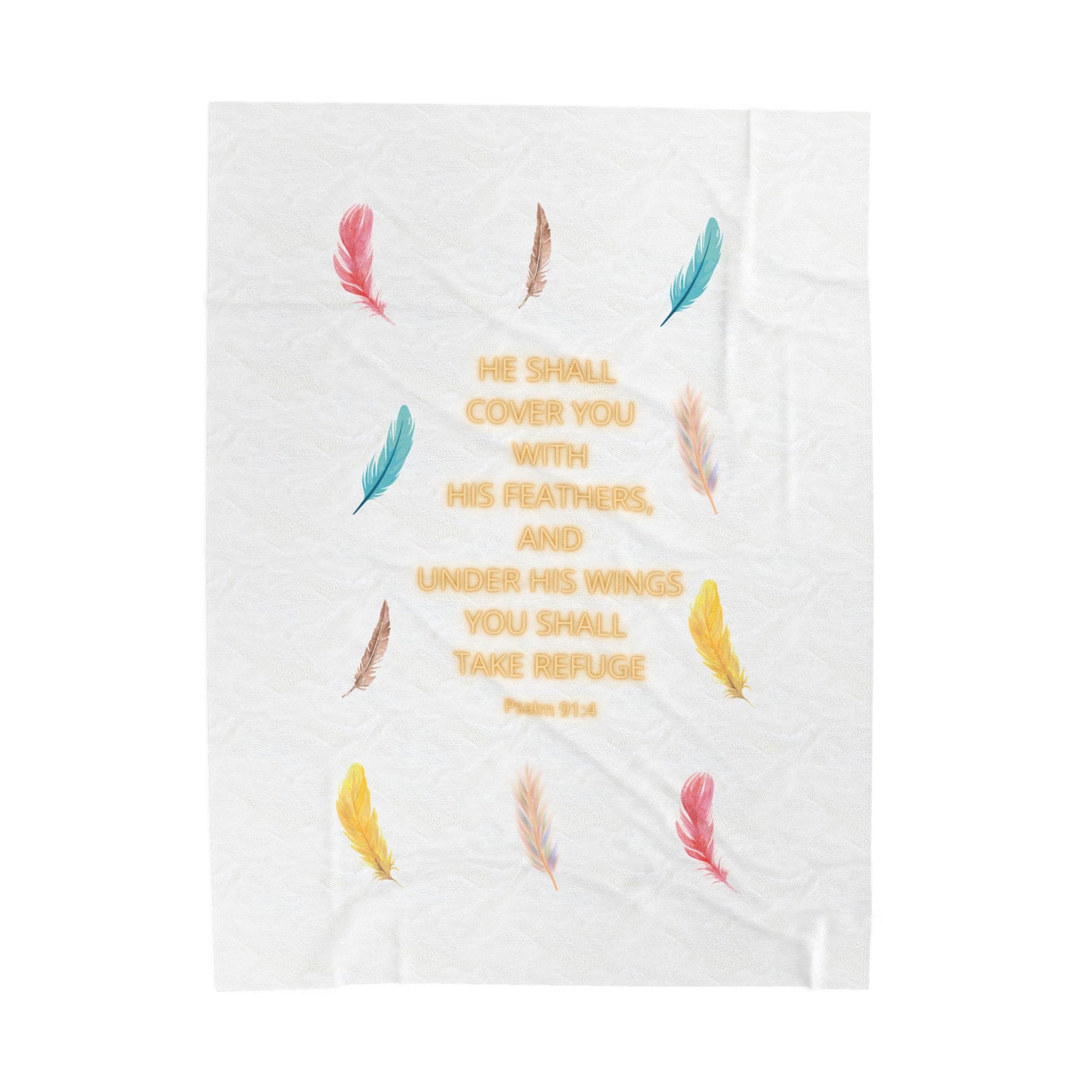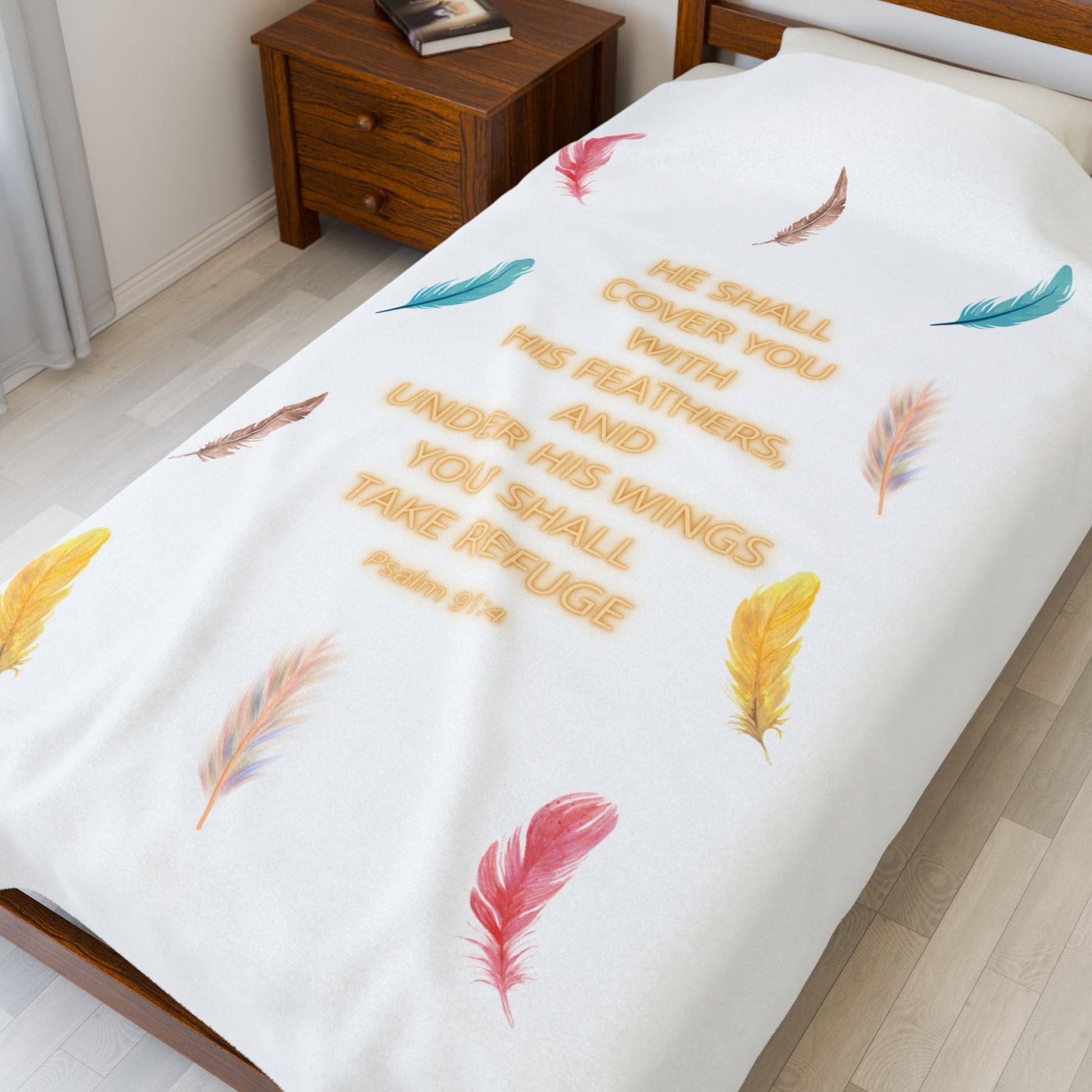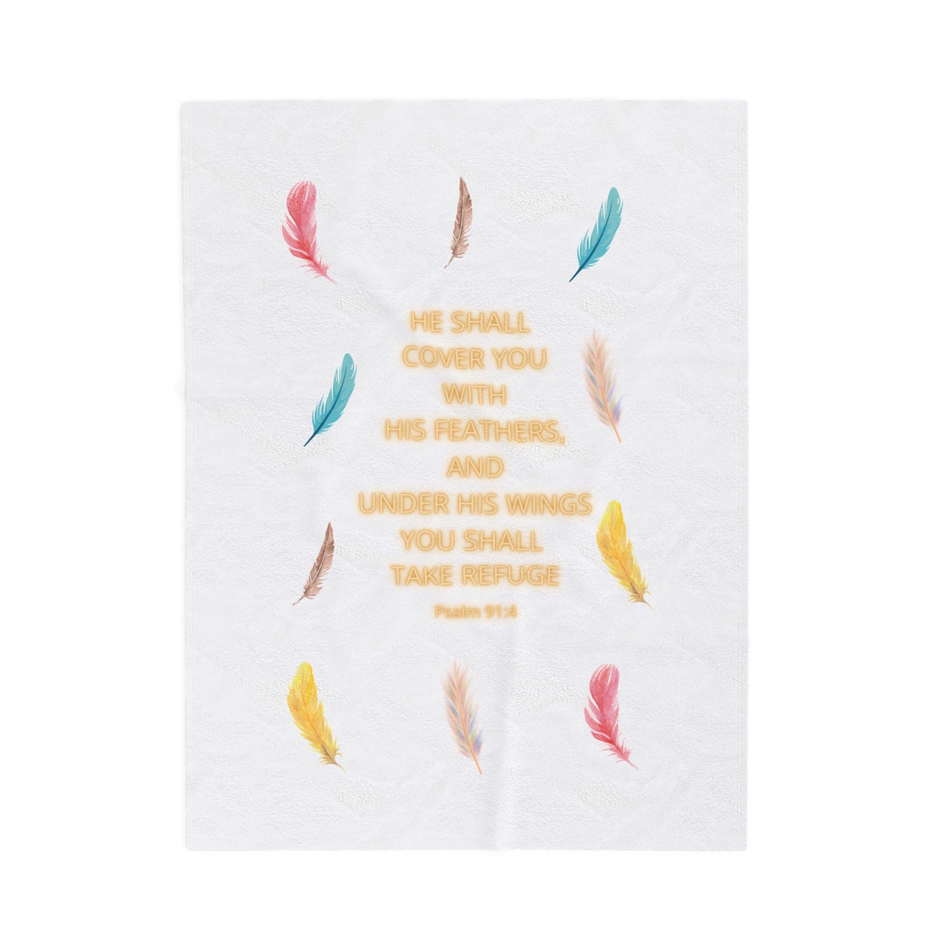 Wrap yourself in comfort with this luxurious Velveteen Plush Blanket. Designed to bring warmth, coziness and the reassurance of God's Word: He shall cover you with His feathers. Psalm 91:4